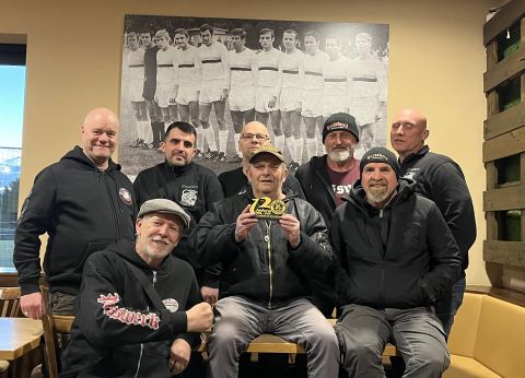 Acht Mitglieder vom Fanclub Presswerk haben dem SC Opel einen Besuch abgestattet und dabei auch die neue Chronik-Wand in der Flur-Galerie in Augenschein genommen. Der Fanclub hat sich im Rahmen der Aktion "Club 120" als Sponsor an der Finanzierung der Zeitreise durch 120 Jahre Vereinsgeschichte beteiligt.Der 1983 gegründete Fanclub war über viele Jahre auch ein Begleiter des SC Opel, auch wenn das Hauptaugenmerk stets Eintracht Frankfurt gilt.