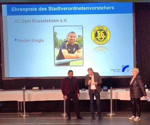 Im Rahmen der Sportlerehrung der Stadt Rüsselsheim wird auch immer ein Ehrenpreis des Stadtverordnetenvorstehers vergeben, der Personen aus dem Sportbereich berücksichtigt, die nicht unter die offiziellen Ehrungskriterien fallen, sich aber dennoch im Sport mit außergewöhnlichen Leistungen oder Initiativen verdient gemacht haben. In diesem Jahr fiel die Wahl auf unseren Jugendleiter Nedim Eroglu unter anderem für seinen Einsatz und sein Engagement beim Projekt "SCO bewegt".