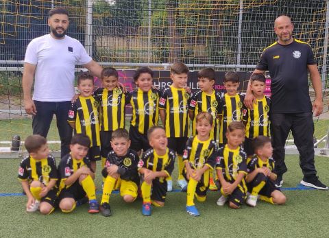 Stolz tragen unsere G1-Junioren die neuen Trikots, die sie einem Sponsor zu verdanken haben: Geles-Transporte, die im Rugbyring 83 in Rüsselsheim ihren Sitz hat. Unternehmer Mehmet Geles (links) und Trainer Amin Fatchat stellten sich mit der Bambina-Mannschaft dem Fotografen.
